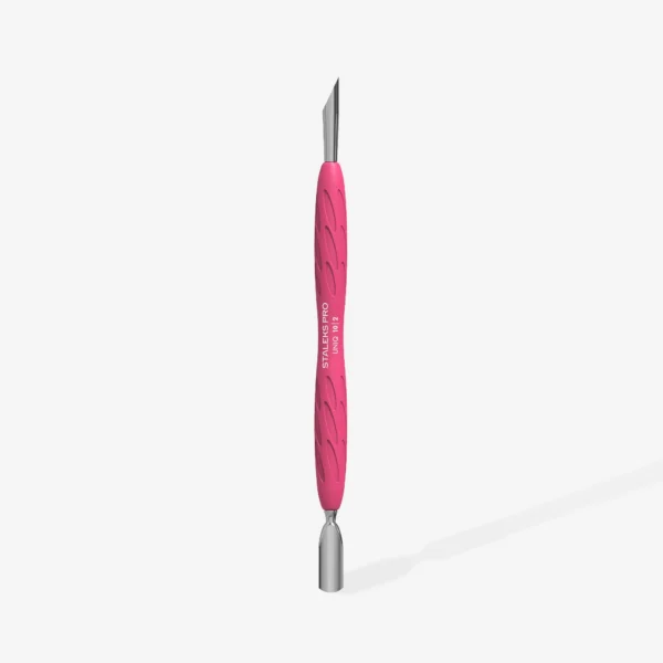 - La parte operativa, “spintore stretto e arrotondato”, è progettata per sollevare e spingere indietro la cuticola; è comoda per lavorare con una lamina ungueale stretta e media.